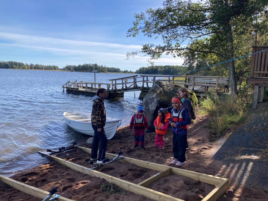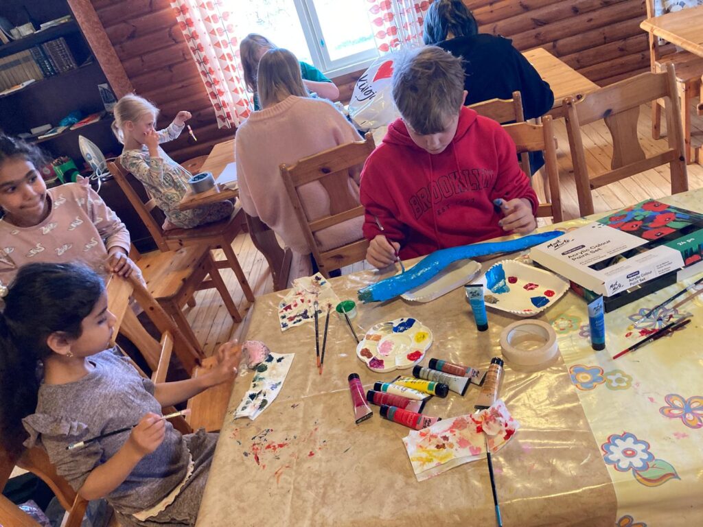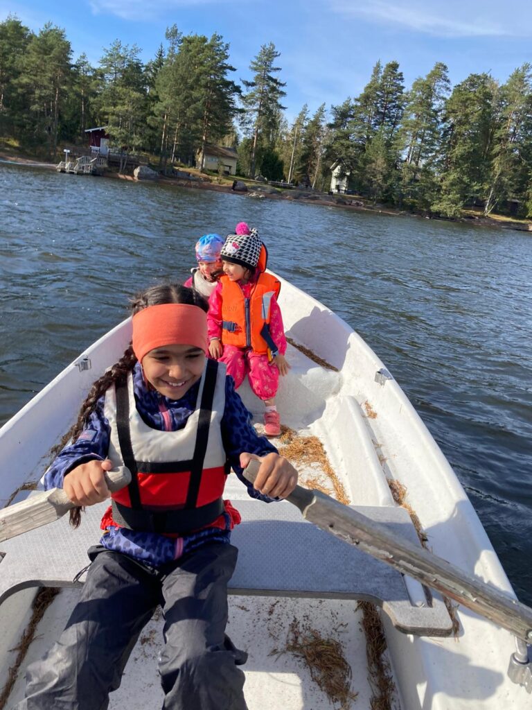 Ja sen jälkeen mentiin soutelemaan veneellä. Ja käytiin syömässä makaronilaatikko ja ruokailun jälkeen mentiin syömään herkkuja. Ja ruokailun jälkeen mentiin pelaamaan pihapelejä. Sitten paistettiin lettuja. Lettujen jälkeen leikittiin. Ja sen jälkeen mentiin saunaan saunamaan ja mentiin uimaan. Ja viimeisteltiin kiviä. Ja sitten iltapalaa. Ja mentiin nukkumaan klo 10:00.