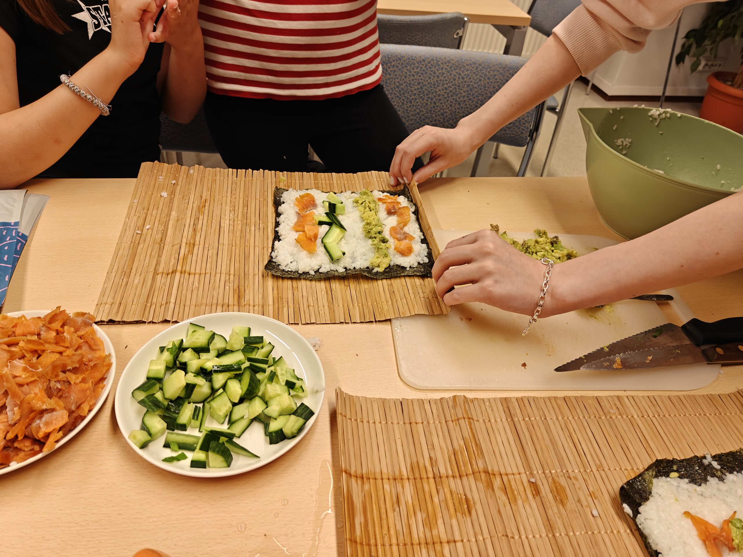 Sushien valmistaminen aloitettiin riisien keittämisellä. Tämän jälkeen pilkottiin kasvikset ja paloiteltiin lohi. Sushien teossa käytettiin lohi- ja tonnikala reseptiä. Täytteenä käytettiin lisäksi kurkkua ja avokadoa. Riisien maustamisen jälkeen sushit täytettiin ja rullattiin ohjaajan ja vertaisohjaajan johdolla.